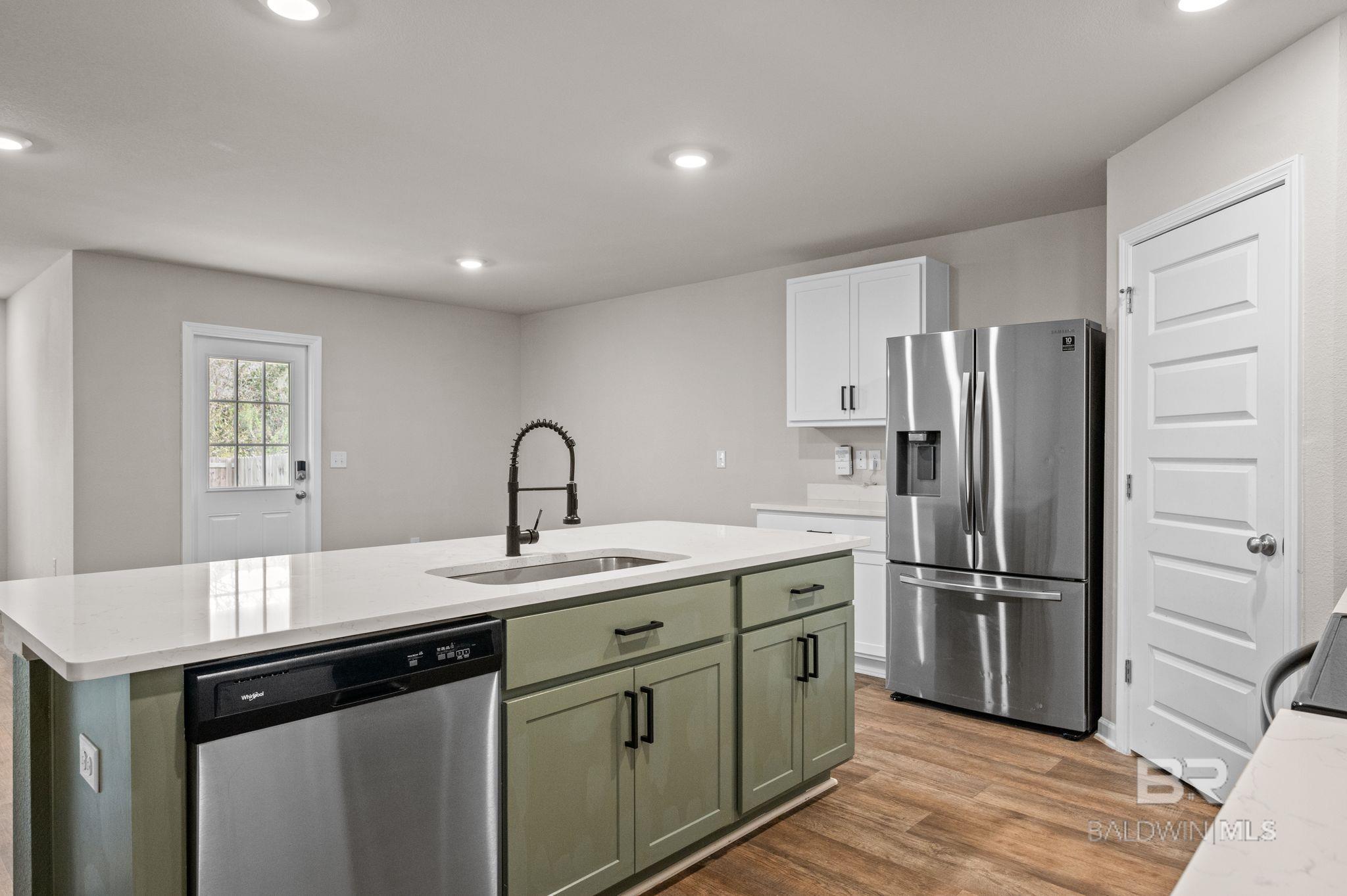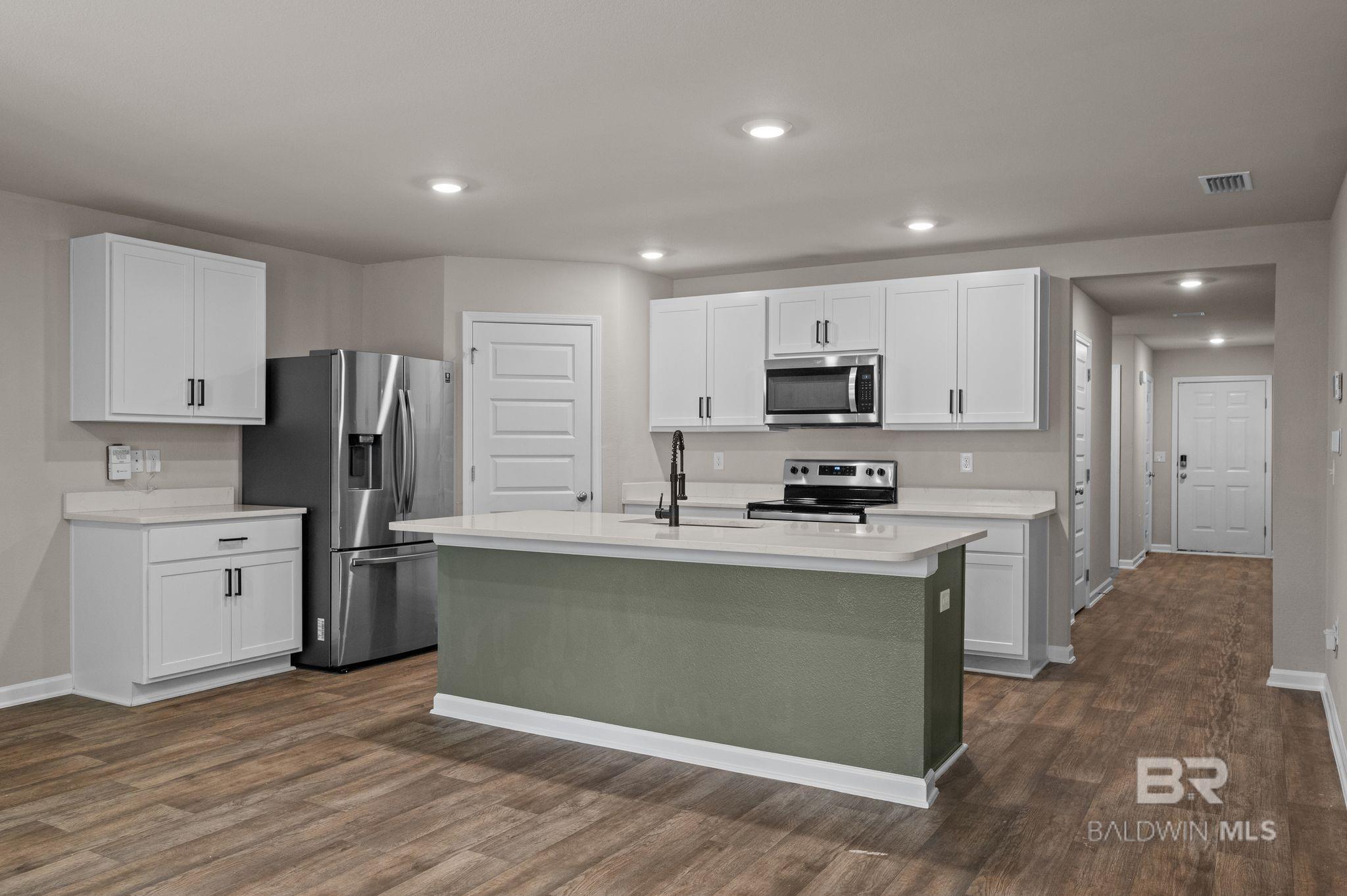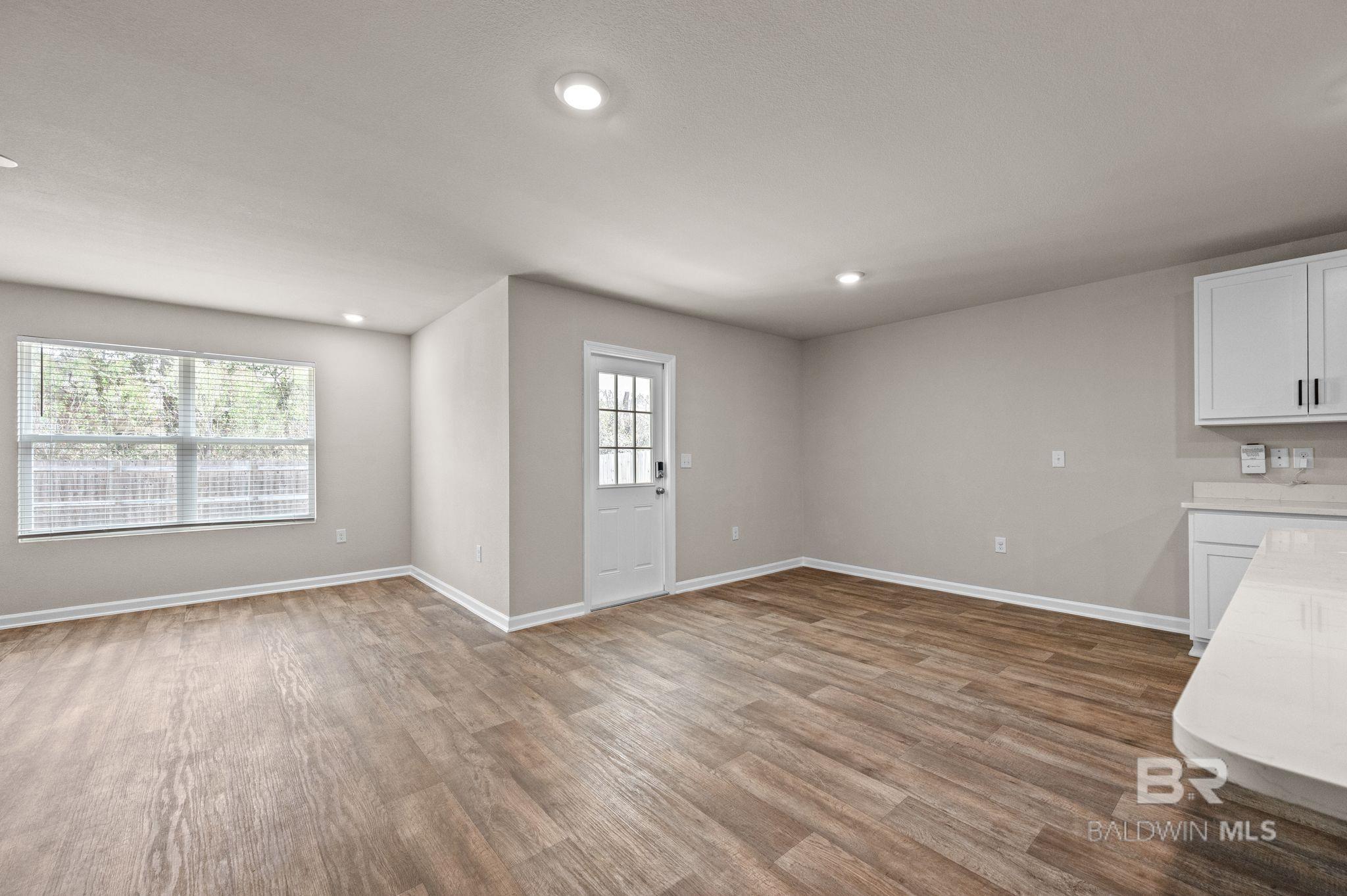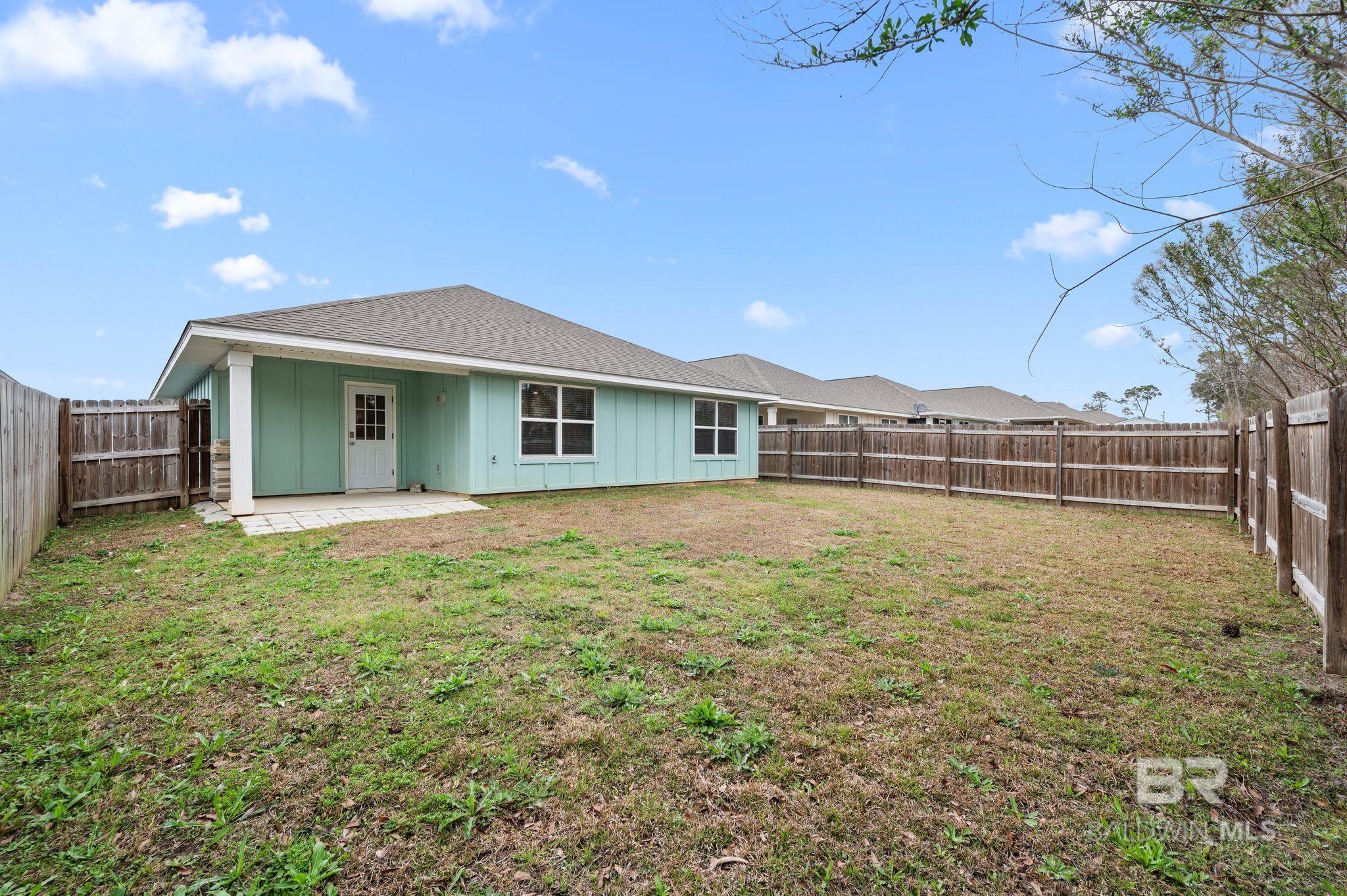 This 4 bedroom, 2 bath Gold Fortified home is located in the Kensington Place subdivision and offers a functional layout with an open concept floorplan connecting the living, dining, and kitchen areas. Features include quartz countertops, stainless steel appliances, and ample cabinet and counter space. The primary bedroom includes a walk-in closet, an en suite bathroom, while the additional bedrooms provide flexibility for guest rooms or office space. A fenced backyard with a covered patio offers outdoor functionality. The property is situated in a quiet, wooded area with convenient access to nearby shopping, dining, and everyday amenities. Gulf Shores beaches are a short drive away. Buyer to verify all information during due diligence.