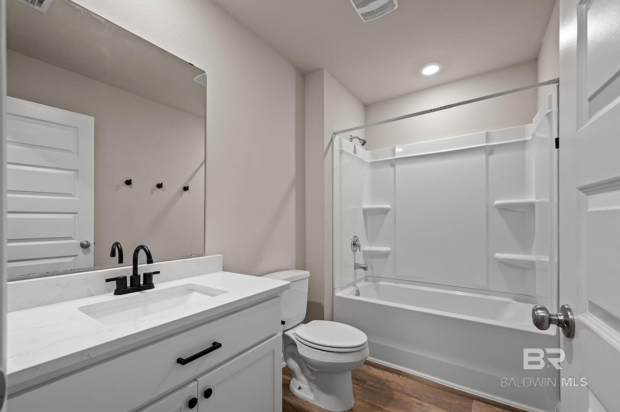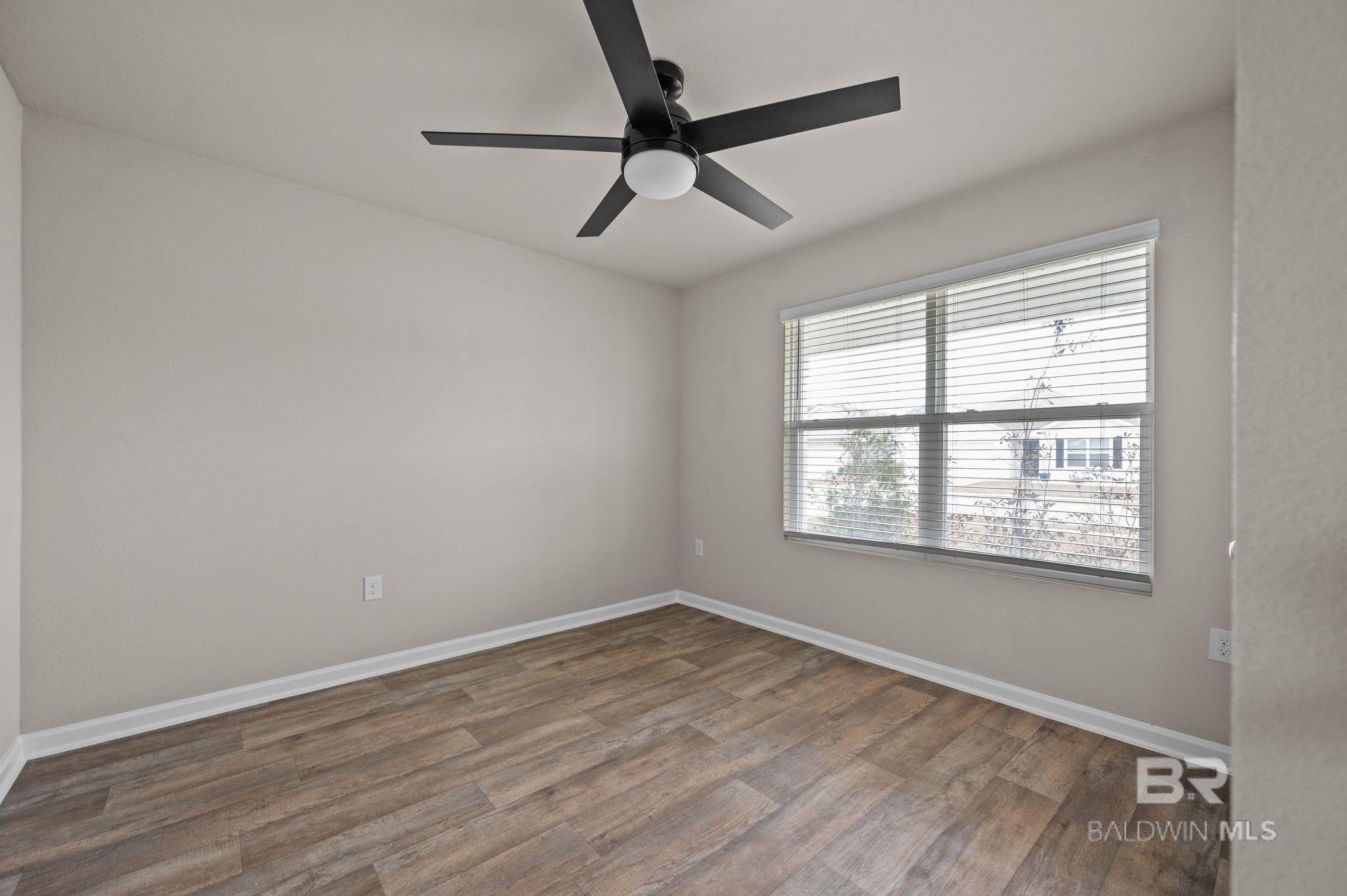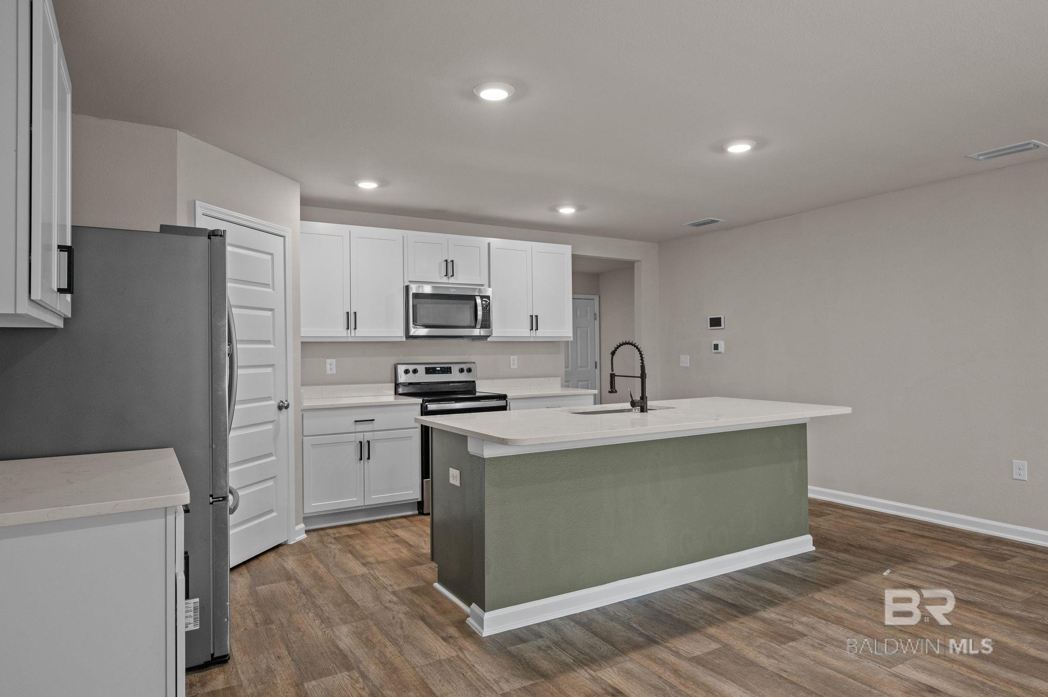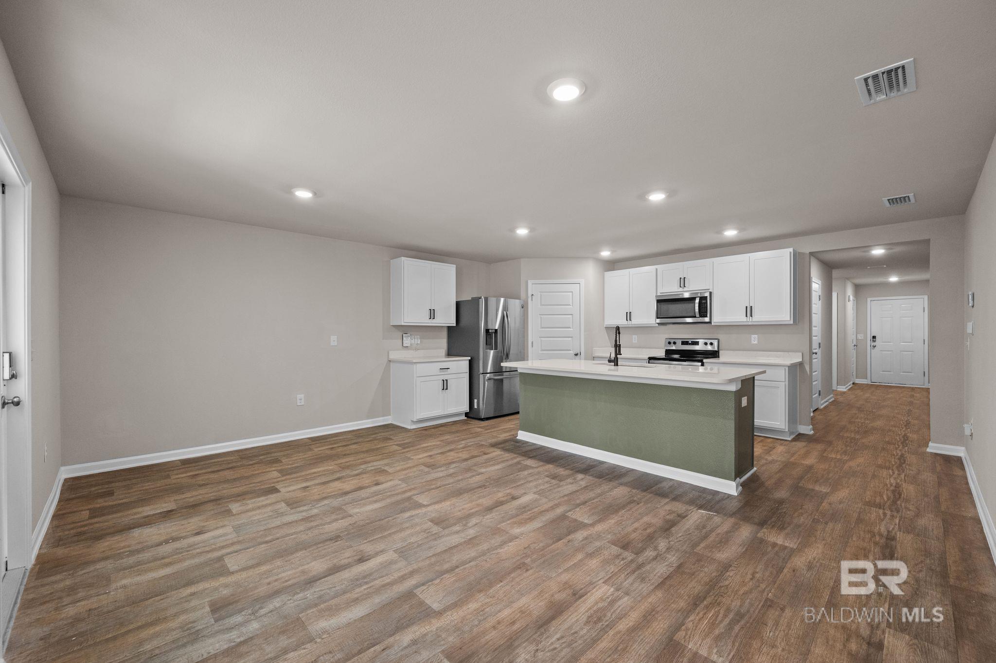 This 4 bedroom, 2 bath Gold Fortified home is located in the Kensington Place subdivision and offers a functional layout with an open concept floorplan connecting the living, dining, and kitchen areas. Features include quartz countertops, stainless steel appliances, and ample cabinet and counter space. The primary bedroom includes a walk-in closet, an en suite bathroom, while the additional bedrooms provide flexibility for guest rooms or office space. A fenced backyard with a covered patio offers outdoor functionality. The property is situated in a quiet, wooded area with convenient access to nearby shopping, dining, and everyday amenities. Gulf Shores beaches are a short drive away. Buyer to verify all information during due diligence.