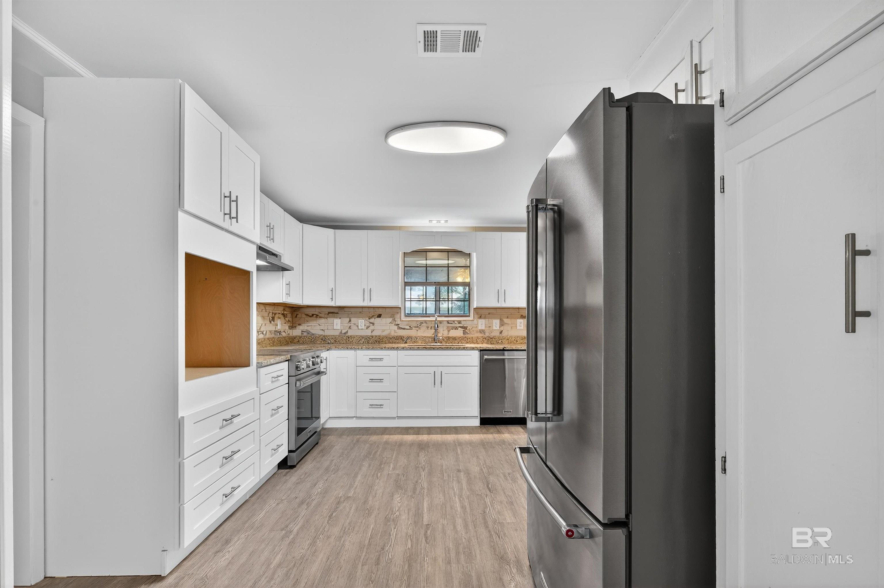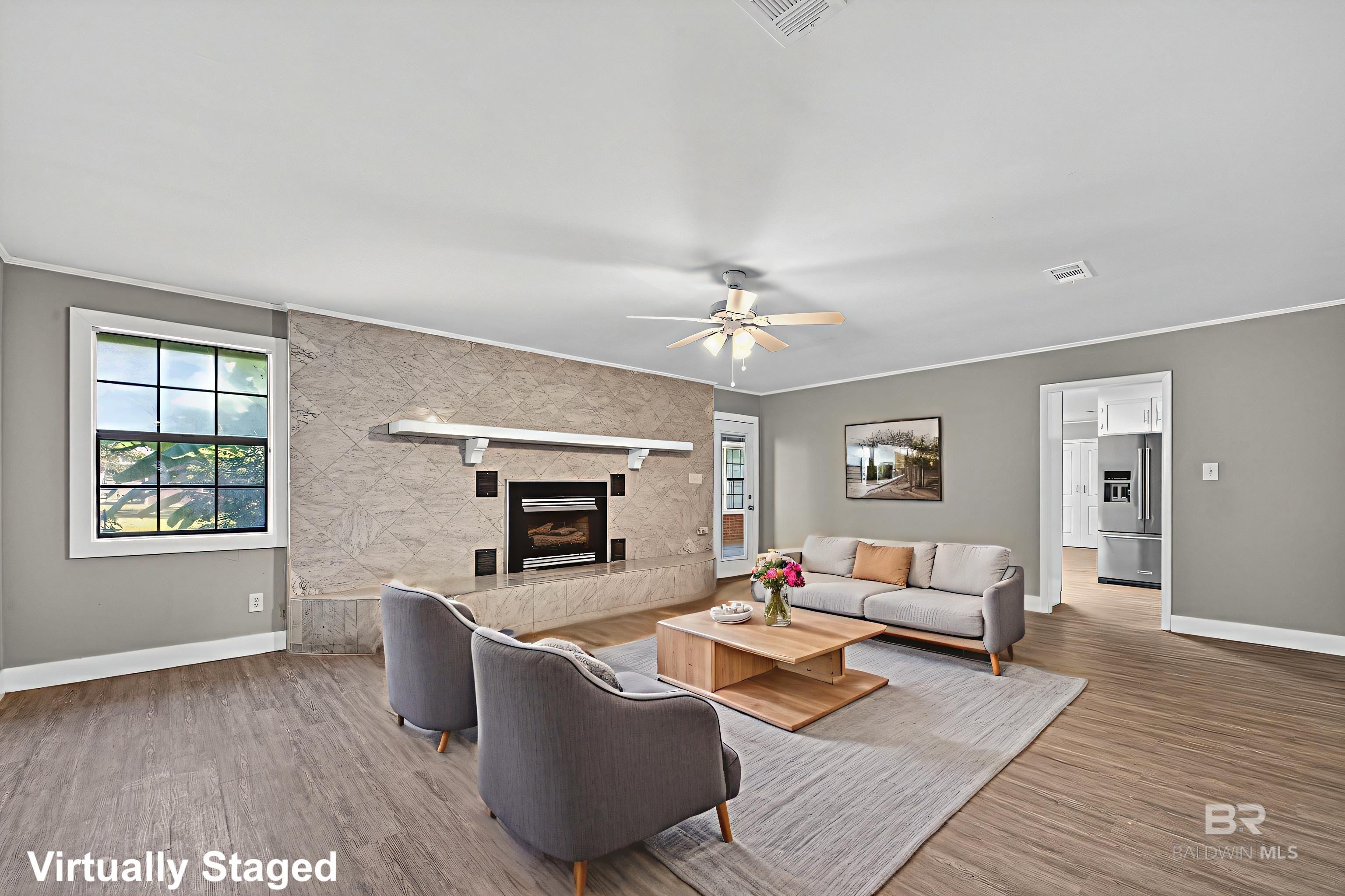 This beautifully renovated home is bursting with updates and charm, making it truly move-in ready, but maintaining the nostalgic feeling! Sitting on three-quarters of an acre lot, you’ll enjoy plenty of space with the convenience of being close to shopping, dining, and entertainment. Enjoy no HOA fees and no flood insurance required! Step inside to find new LVP flooring and fresh paint throughout, NEW HVAC, a fully remodeled kitchen with brand-new cabinetry, granite countertops, a new, premium Thor stove & dishwasher, and stunning design touches at every turn. Upon entry, you’re greeted by a formal living and dining area that flows into the spacious great room, complete with a beautiful tiled fireplace and mantle. The eat-in kitchen has a breakfast bar and can be accessed from both the dining area and great room. The primary suite is a true retreat, featuring a beautifully tiled walk-in shower with a built-in seat, new vanity with granite countertop, and modern fixtures. The guest bathrooms have also been refreshed with granite-top vanities, stylish updates, new cabinetry, and one features a brand-new tiled shower/tub. Throughout the home, you’ll also find all new light fixtures and ceiling fans, plus NEW energy-efficient WINDOWS throughout with the exception of the huge sunroom. Outdoor living is a dream here. Relax on the large covered front porch or enjoy mornings and evenings on the back covered patio and MASSIVE SUNROOM where you can sip coffee, watch the birds, or entertain guests. The property also includes fresh landscaping, two new smart garage doors, and an 18x20 metal building on a concrete slab, great for storage or a workshop. Just one minute from OWA, across the street from Glenlakes Golf Course, a short drive to Foley’s shopping and dining, and only 10 miles from Alabama’s most beautiful beaches, the location is unmatched. Whether you’re looking for a full-time home, a vacation retreat, or an investment property, this one truly has it all. Buyer to v