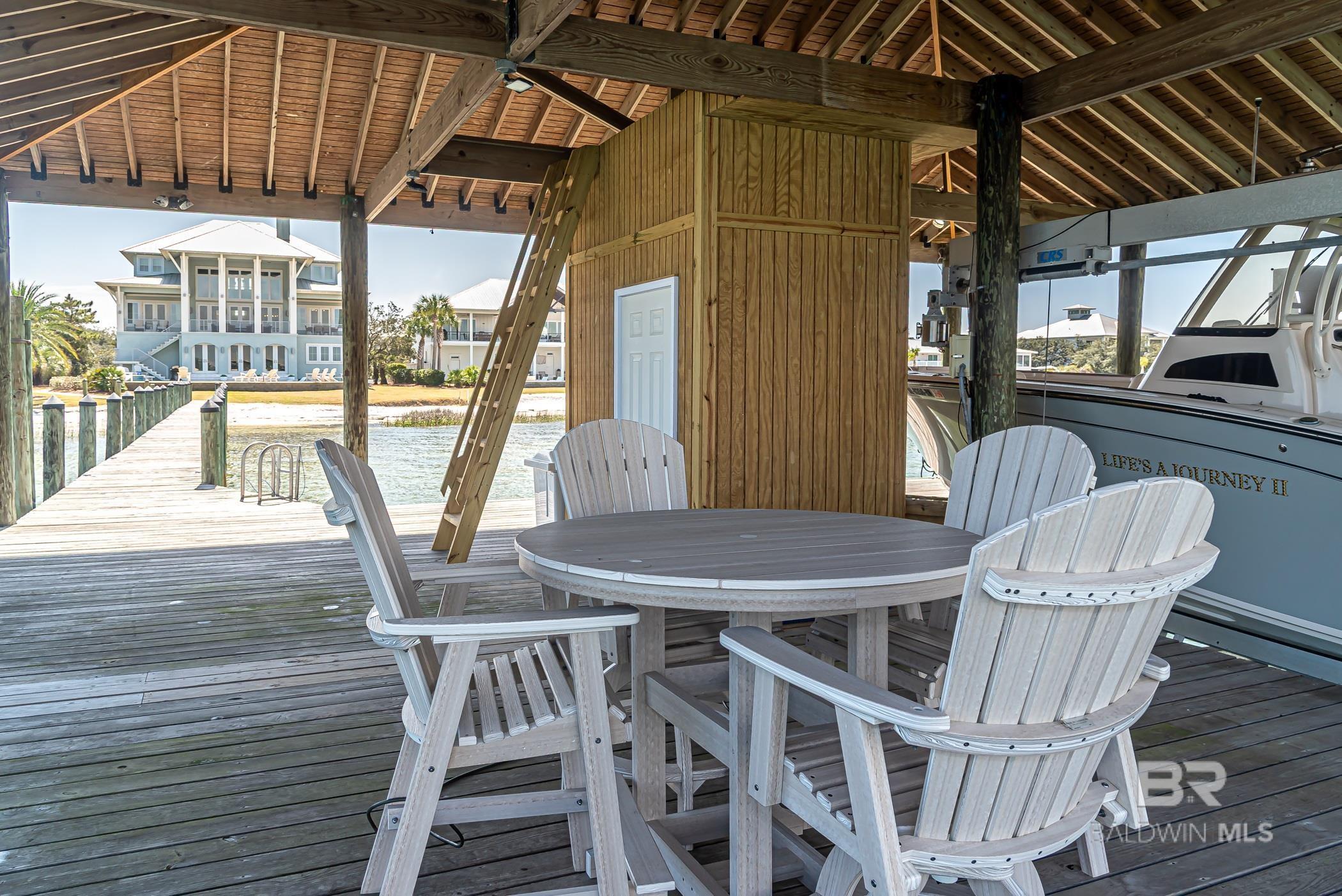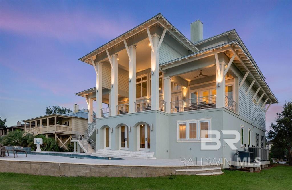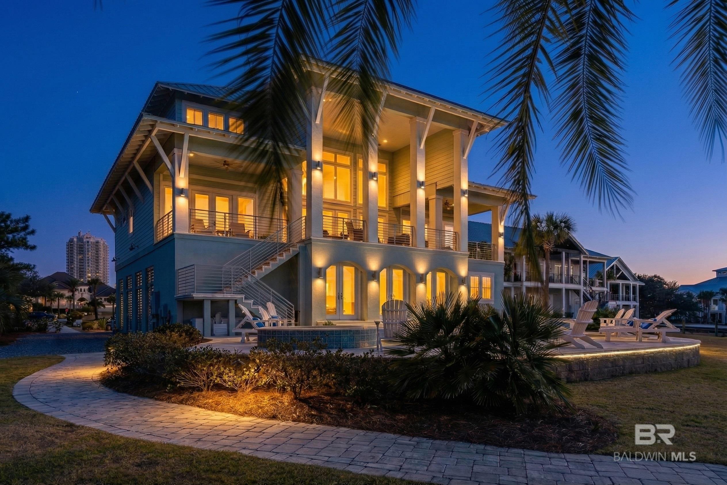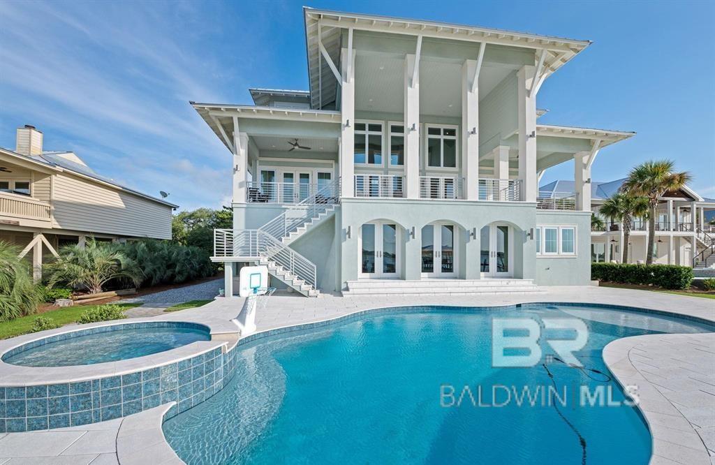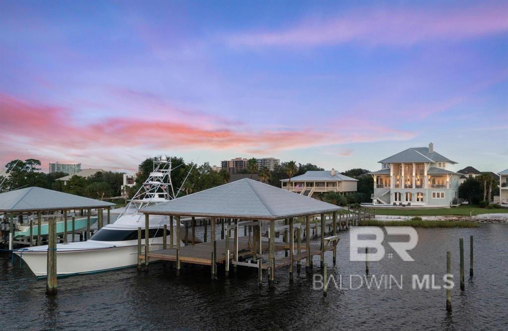 Deep Water Living on Bayou St. John – Ono Island!! Need deep water for your large yacht' This custom waterfront home is located on the northwest side of Ono Island along the beautiful waters of Bayou St. John, offering approximately 11 feet of water depth and convenient access to Perdido Pass. The private dock features two boat slips—one accommodating a 65+ ft vessel and a second slip with a 16,000 lb lift for a large Center Console boat or Pontoon. The dock also includes storage and a fish cleaning station, making it ideal for boating and fishing. Inside, the gourmet kitchen with GE Monogram appliances overlooks the expansive great room and waterfront views, creating a perfect space for gathering and entertaining. Unique architectural elements include jellyfish chandeliers highlighting the grand staircase. The home offers 7 bedrooms and 5½ baths, including two primary en-suite bedrooms on the main level, both opening directly to outdoor living spaces. Additional features include a built-in elevator, natural gas fireplace, and main-level laundry. Downstairs you have a full Captain's Quarters complete with Sleeping for 6, a Full Kitchen, Laundry Room, Living area and meeting room for planning out your fishing strategy before setting out on our beautiful Gulf Waters. Outdoor living is designed for relaxation with a saltwater pool, hot tub with waterfall features, and spacious entertaining areas furnished with Polywood outdoor furniture, all overlooking the tranquil waters of Bayou St. John. Built with quality and durability in mind, the home features poured-in-place concrete construction, impact windows, and a standing seam metal roof. The property offers approximately 6,013 square feet of living space and 102± feet of waterfront. A rare opportunity for deep water living in Orange Beach with exceptional boating accommodations. Buyer to verify all information during due diligence.