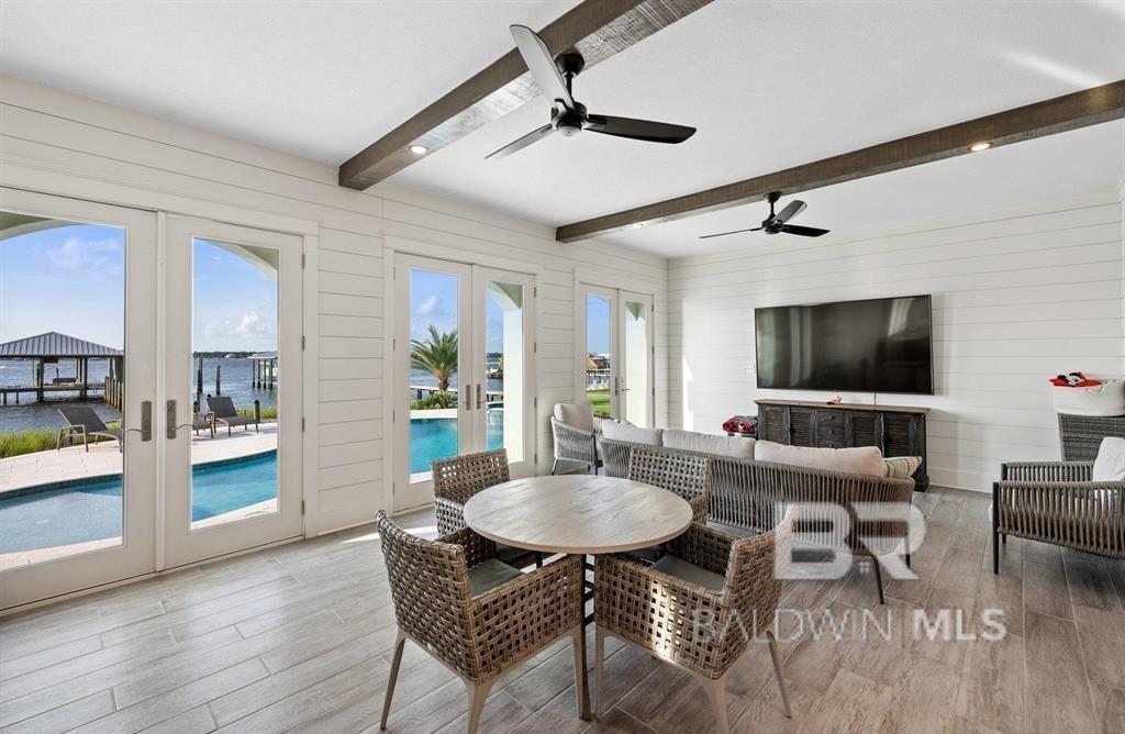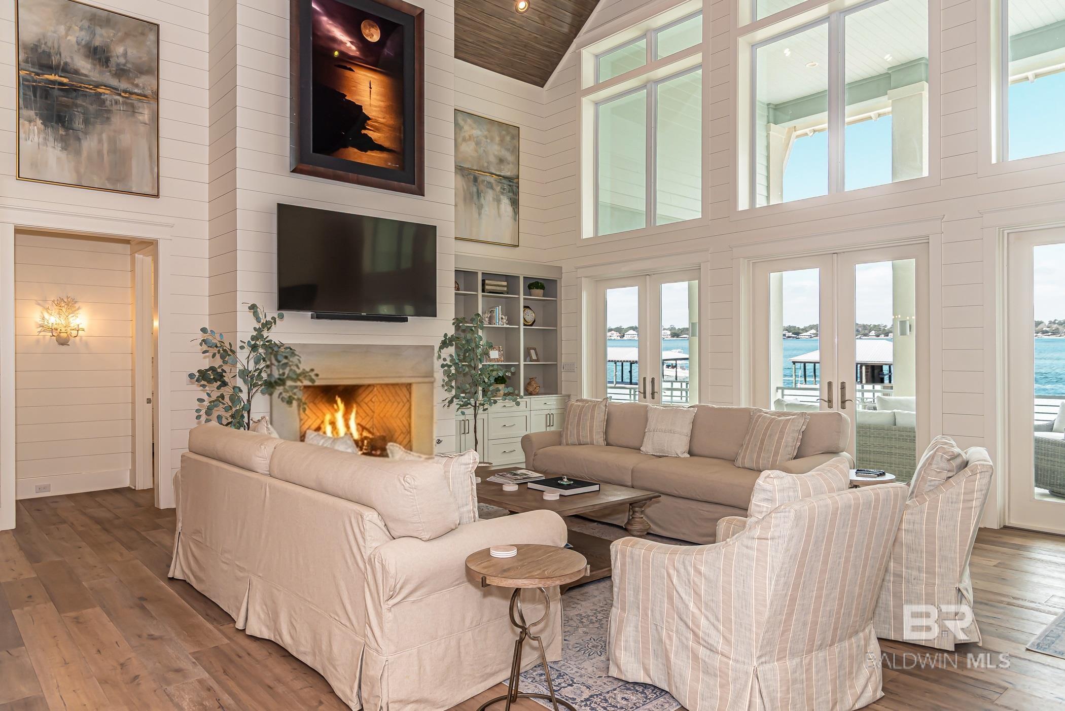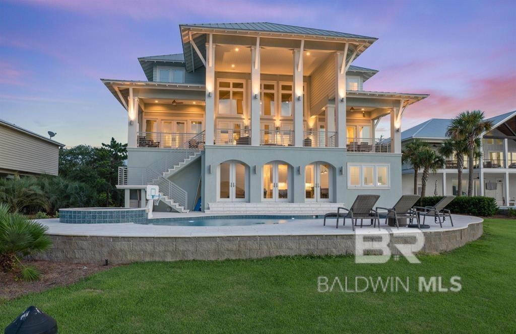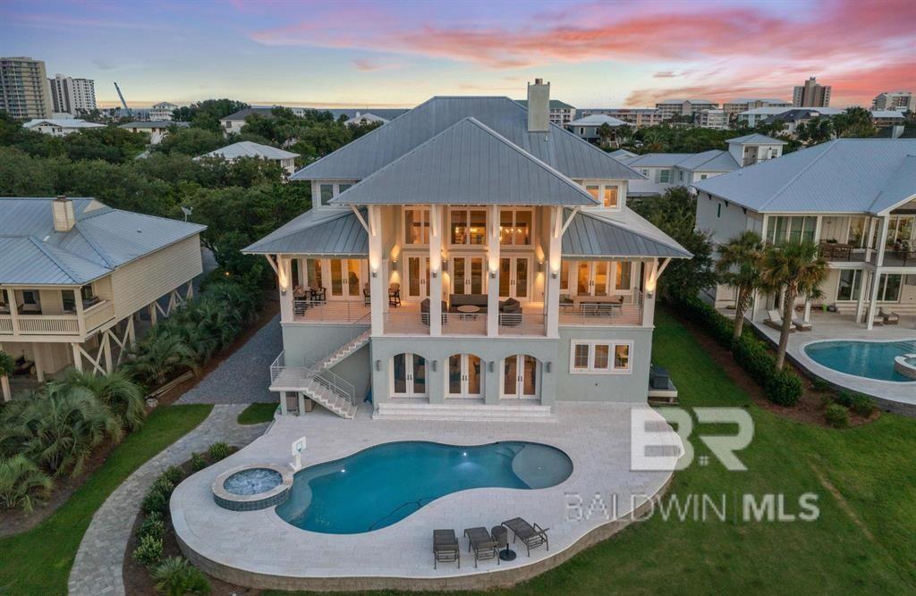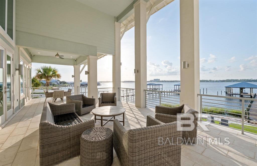 Deep Water Living on Bayou St. John – Ono Island!! Need deep water for your large yacht' This custom waterfront home is located on the northwest side of Ono Island along the beautiful waters of Bayou St. John, offering approximately 11 feet of water depth and convenient access to Perdido Pass. The private dock features two boat slips—one accommodating a 65+ ft vessel and a second slip with a 16,000 lb lift for a large Center Console boat or Pontoon. The dock also includes storage and a fish cleaning station, making it ideal for boating and fishing. Inside, the gourmet kitchen with GE Monogram appliances overlooks the expansive great room and waterfront views, creating a perfect space for gathering and entertaining. Unique architectural elements include jellyfish chandeliers highlighting the grand staircase. The home offers 7 bedrooms and 5½ baths, including two primary en-suite bedrooms on the main level, both opening directly to outdoor living spaces. Additional features include a built-in elevator, natural gas fireplace, and main-level laundry. Downstairs you have a full Captain's Quarters complete with Sleeping for 6, a Full Kitchen, Laundry Room, Living area and meeting room for planning out your fishing strategy before setting out on our beautiful Gulf Waters. Outdoor living is designed for relaxation with a saltwater pool, hot tub with waterfall features, and spacious entertaining areas furnished with Polywood outdoor furniture, all overlooking the tranquil waters of Bayou St. John. Built with quality and durability in mind, the home features poured-in-place concrete construction, impact windows, and a standing seam metal roof. The property offers approximately 6,013 square feet of living space and 102± feet of waterfront. A rare opportunity for deep water living in Orange Beach with exceptional boating accommodations. Buyer to verify all information during due diligence.