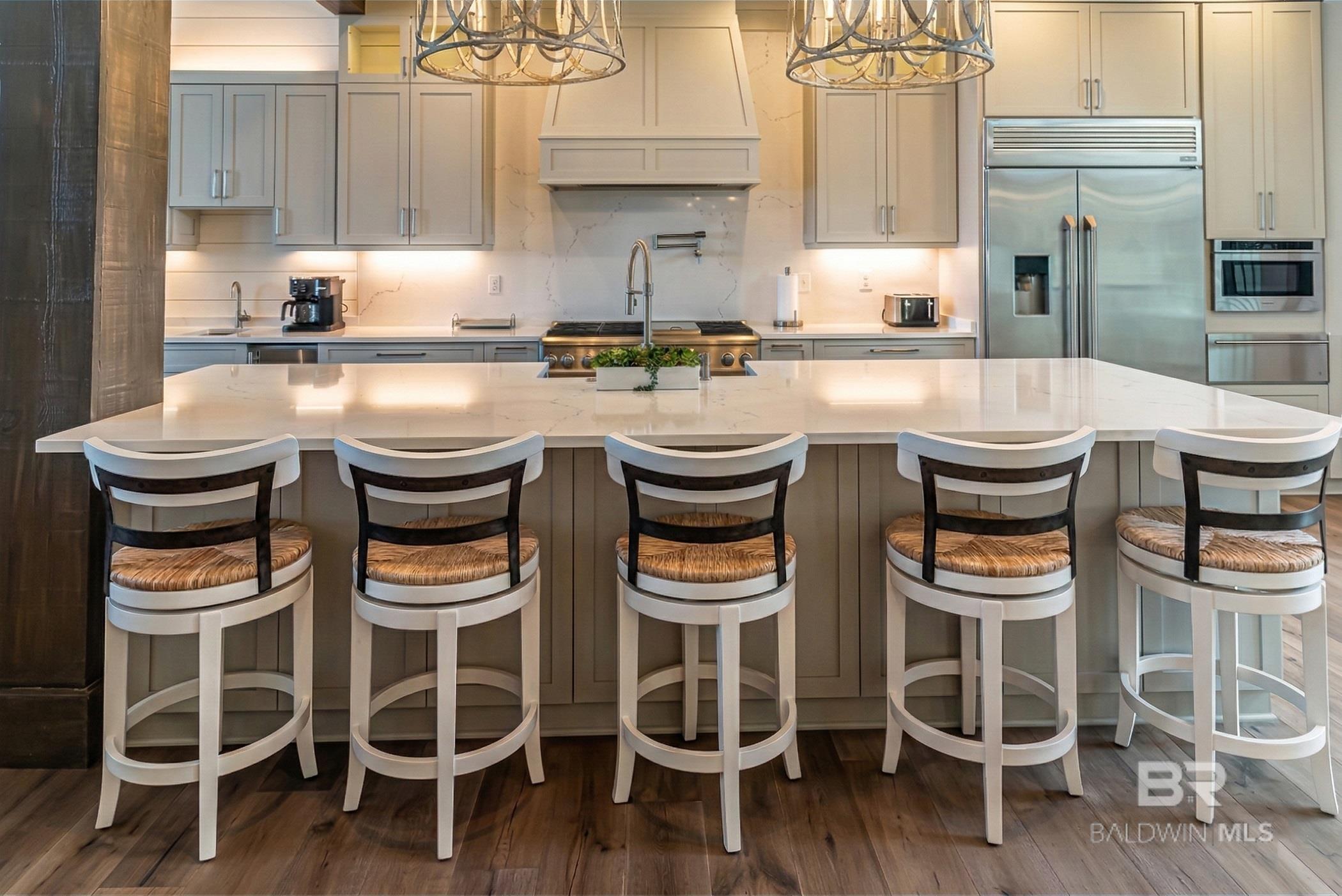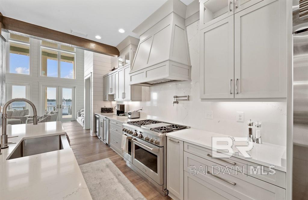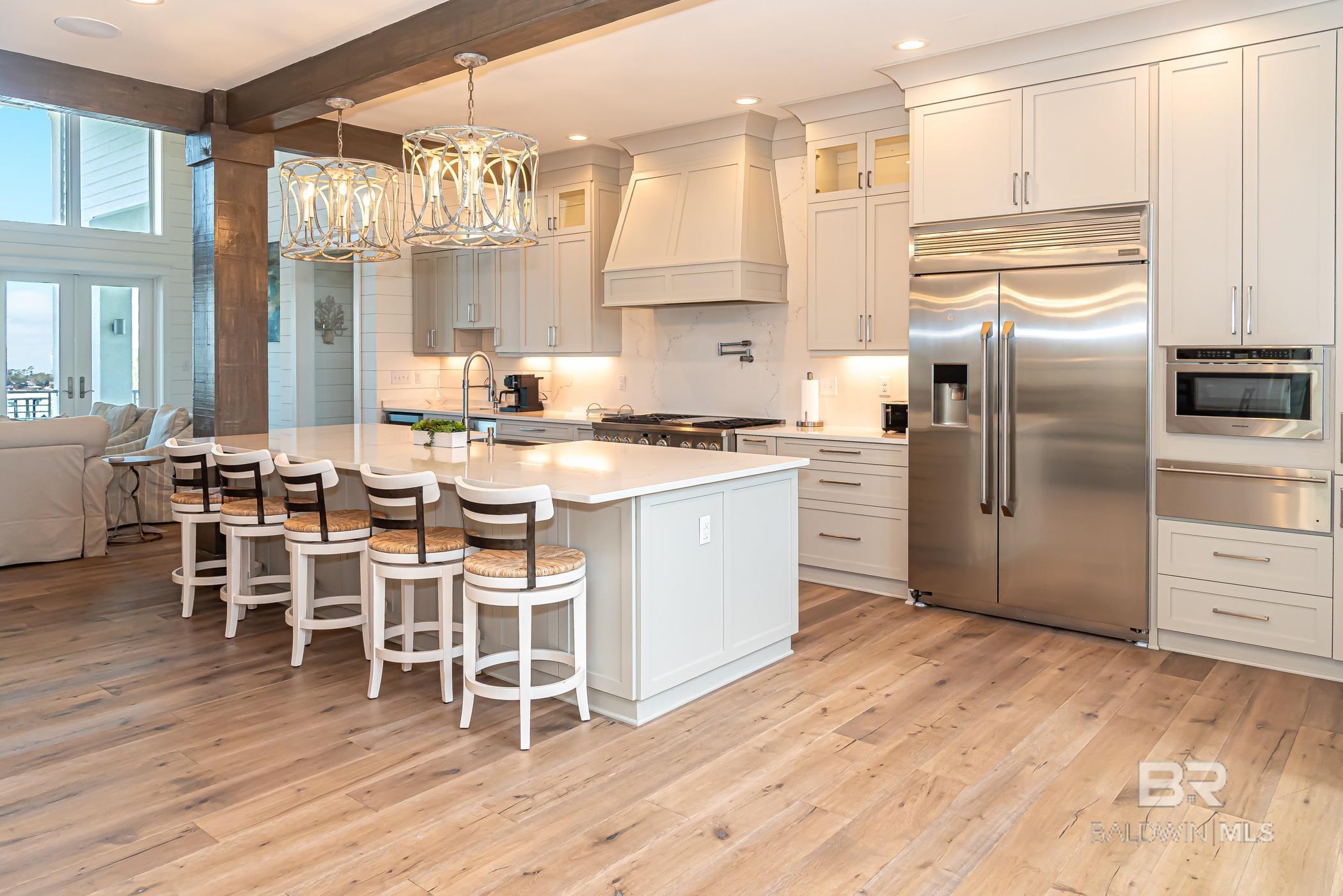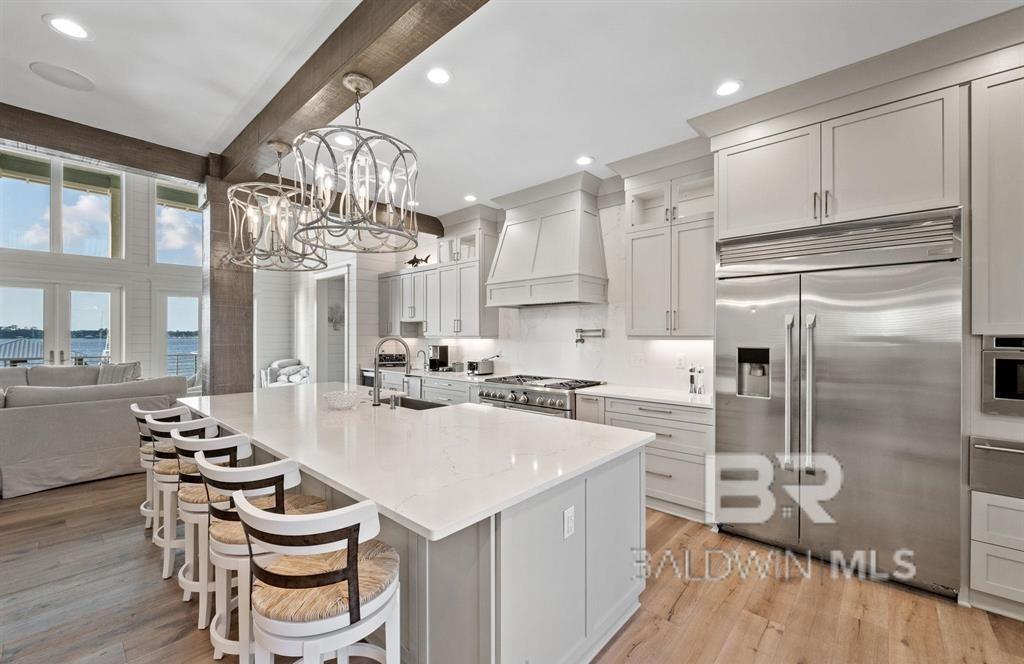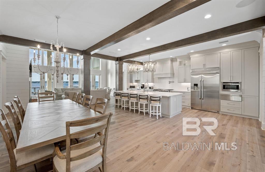 Deep Water Living on Bayou St. John – Ono Island!! Need deep water for your large yacht' This custom waterfront home is located on the northwest side of Ono Island along the beautiful waters of Bayou St. John, offering approximately 11 feet of water depth and convenient access to Perdido Pass. The private dock features two boat slips—one accommodating a 65+ ft vessel and a second slip with a 16,000 lb lift for a large Center Console boat or Pontoon. The dock also includes storage and a fish cleaning station, making it ideal for boating and fishing. Inside, the gourmet kitchen with GE Monogram appliances overlooks the expansive great room and waterfront views, creating a perfect space for gathering and entertaining. Unique architectural elements include jellyfish chandeliers highlighting the grand staircase. The home offers 7 bedrooms and 5½ baths, including two primary en-suite bedrooms on the main level, both opening directly to outdoor living spaces. Additional features include a built-in elevator, natural gas fireplace, and main-level laundry. Downstairs you have a full Captain's Quarters complete with Sleeping for 6, a Full Kitchen, Laundry Room, Living area and meeting room for planning out your fishing strategy before setting out on our beautiful Gulf Waters. Outdoor living is designed for relaxation with a saltwater pool, hot tub with waterfall features, and spacious entertaining areas furnished with Polywood outdoor furniture, all overlooking the tranquil waters of Bayou St. John. Built with quality and durability in mind, the home features poured-in-place concrete construction, impact windows, and a standing seam metal roof. The property offers approximately 6,013 square feet of living space and 102± feet of waterfront. A rare opportunity for deep water living in Orange Beach with exceptional boating accommodations. Buyer to verify all information during due diligence.