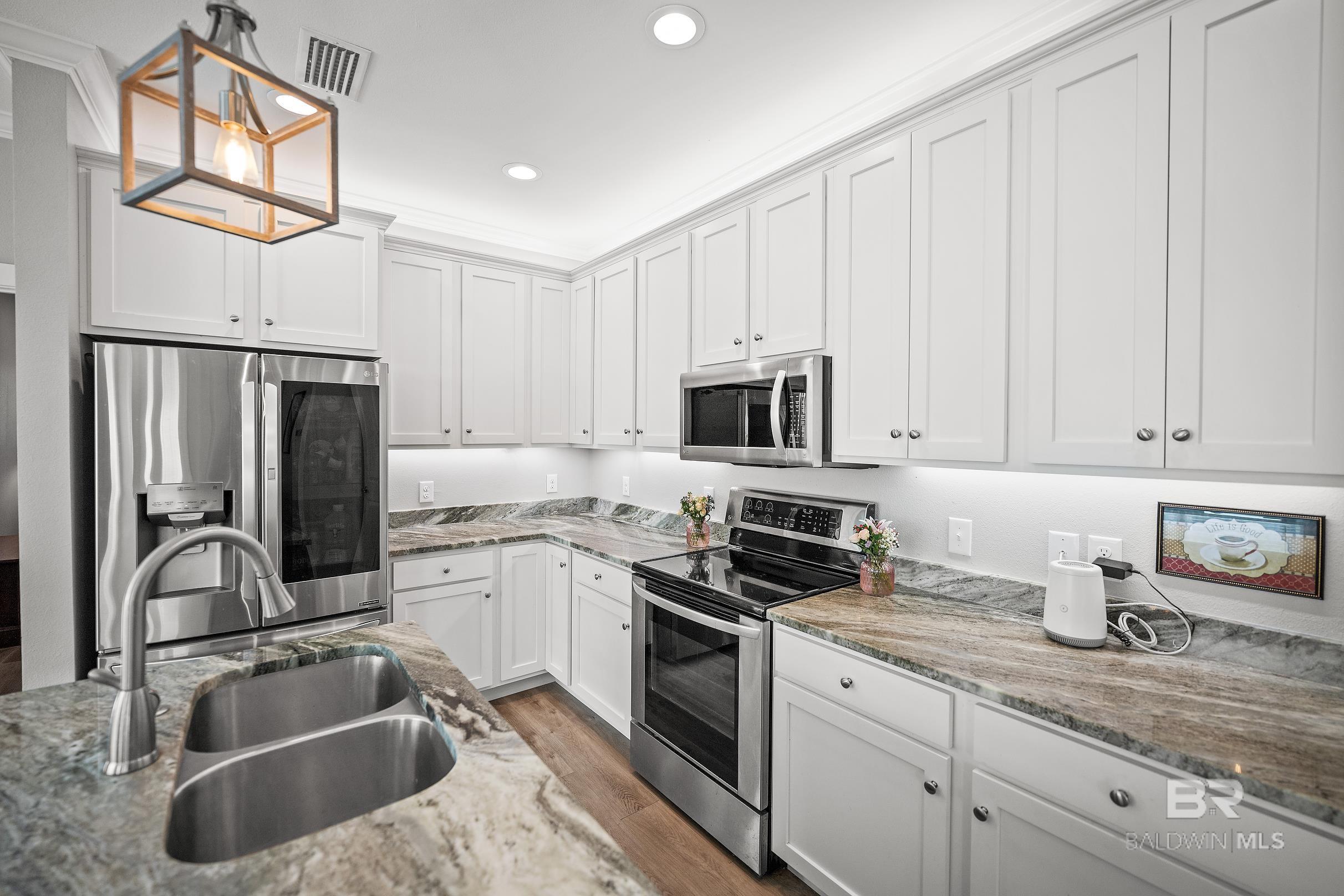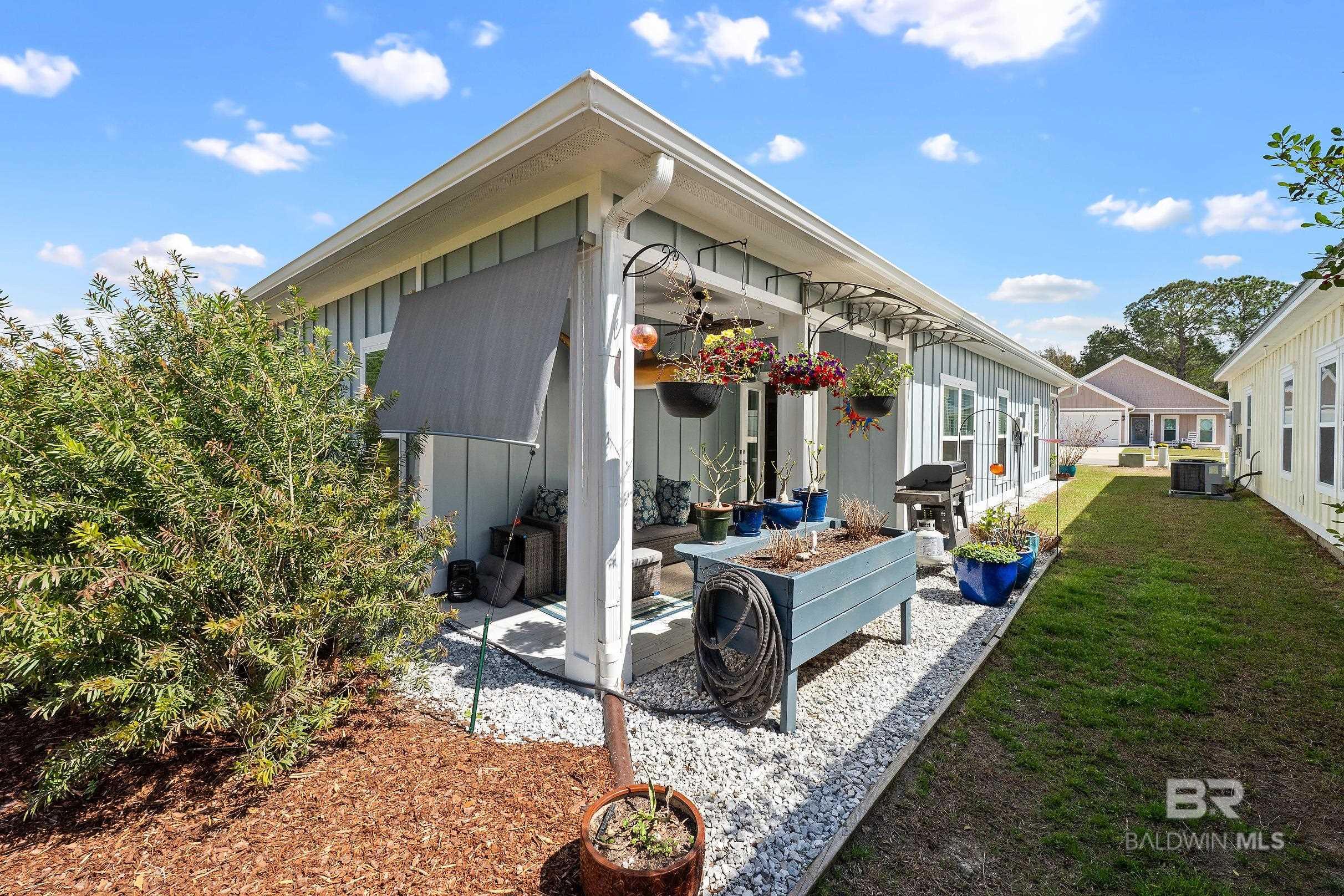 Charming patio home, with must see location:15-minute drive to theGulf of Mexico’s white beaches, minutes to the beach express, and multiple shopping centers. This home stands above the rest with its 9ft ceilings, crown molding, metal roof, granite countertops, and luxury wood vinyl flooring throughout. The homes floor plan is functional including foyer, nice size utility room, and pantry. The spacious primary bedroom and bathroom is equipped with walk-in closet, dual sinks, oversized walk-in tiled shower with rain shower head. Enjoy your morning coffee on the 8 X 16 covered patio. The home backs up to the community walking path with mature Magnolia trees. Exterior includes gutters, and up graded landscaping package. Enjoy a discount on your homeowner’s insurance due to being built to the gold fortified standard with certification and 140 hour impact windows. Subdivision Allows Short Term Rentals. Buyer to verify all information during due diligence.