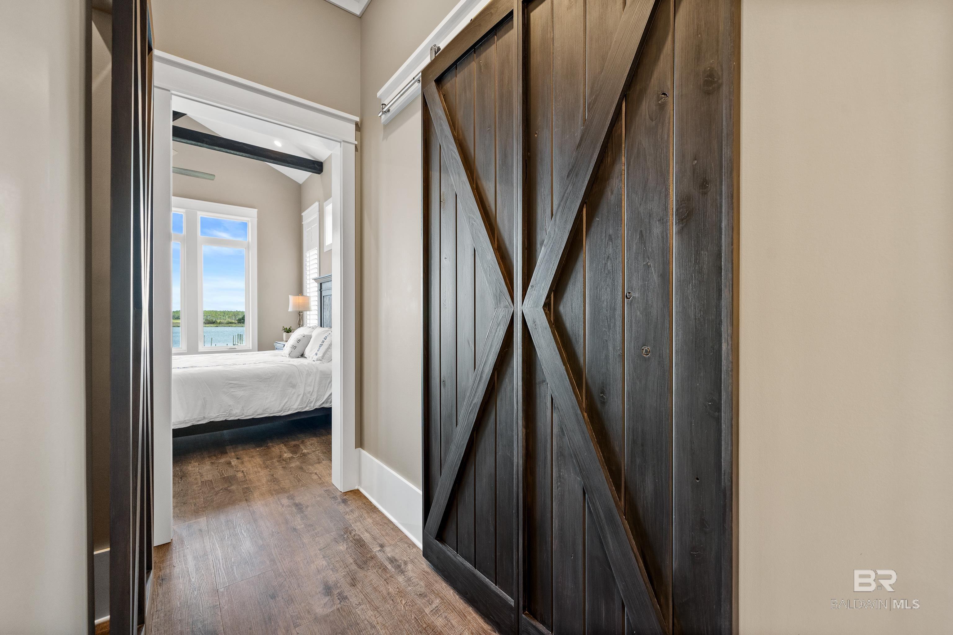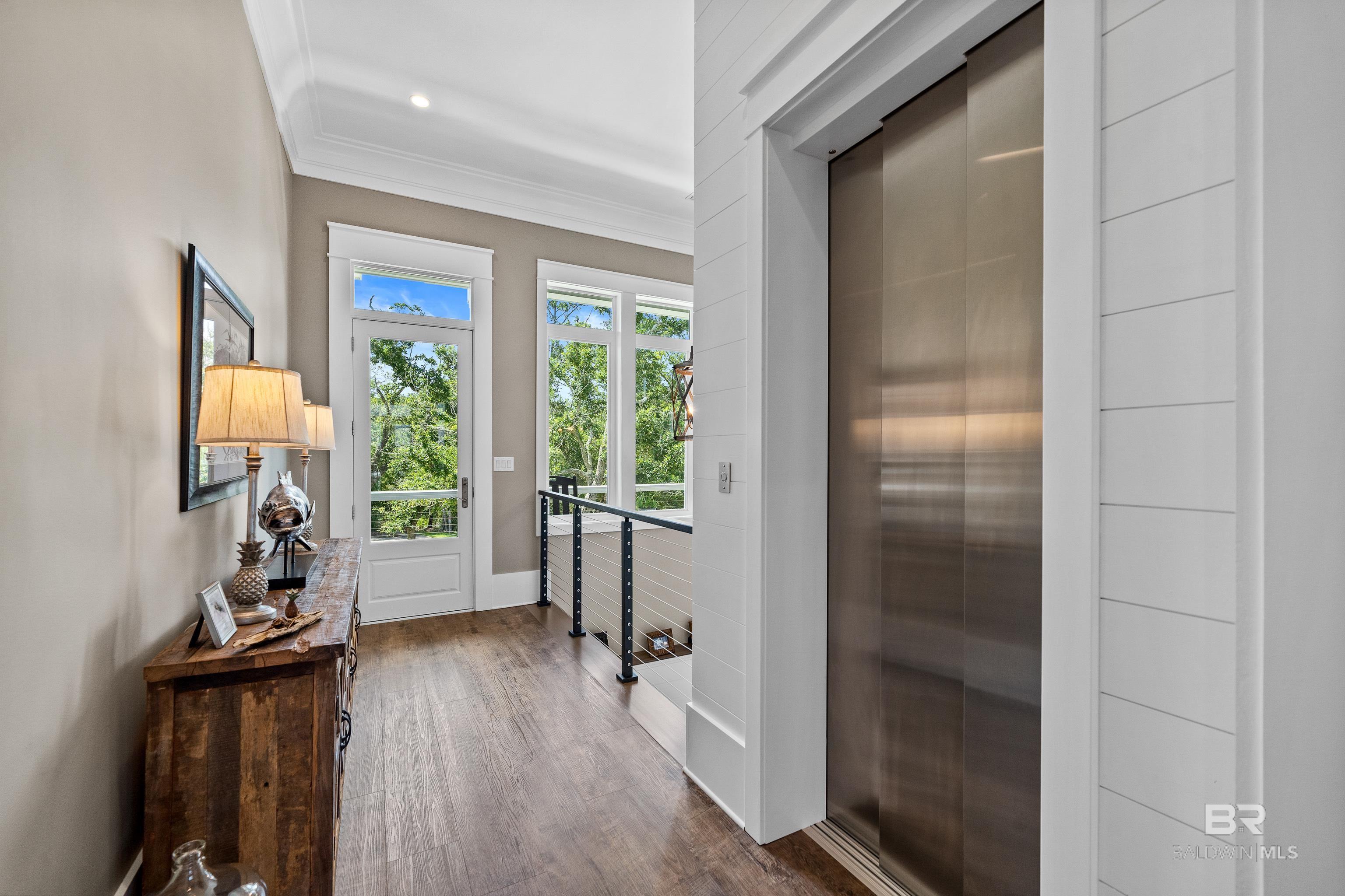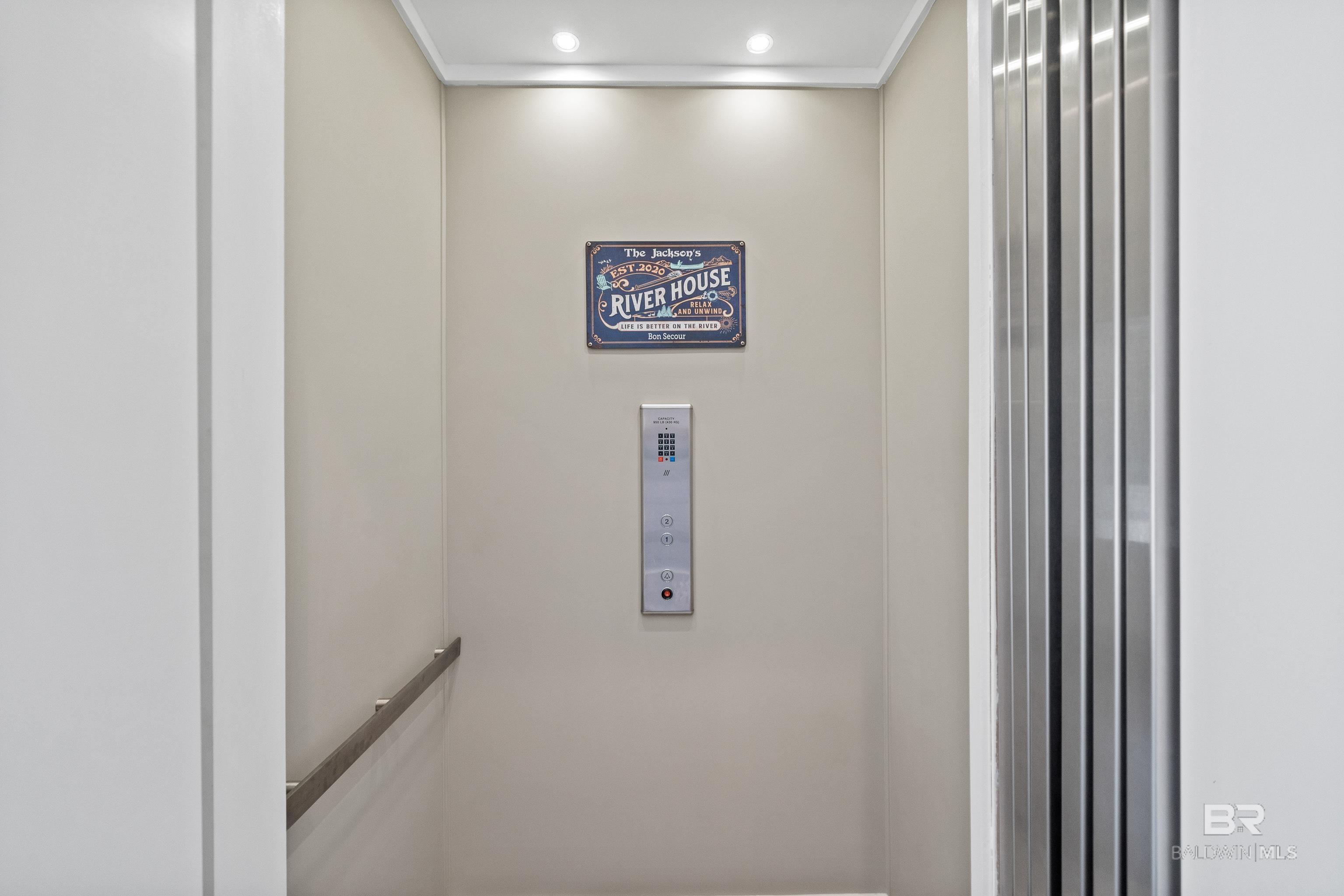 Custom-designed, Gold Fortified home, unique in the Gulf Shores community, located in gated Riverdance. Direct riverfront offering unparalleled views of nearly 1 mile of the Bon Secour River & borders forever wetlands across the river. Enjoy fishing, bird watching, dolphin visits & amazing sunsets. 2,542 sq ft built on marine grade pilings, 3 beds, 2 baths all on one level w/ high end elevator w/ stainless doors from ground level to the living area. Open floor plan w/ 12 ft ceilings, tall casement windows, luxury LVP flooring, heavy window/baseboard trim, 8 ft solid wood doors, plantation shutters & triple-level heavy crown molding throughout. Living space w/ shiplap gas fireplace, custom live-edge oak mantle connecting a foyer to the upper front porch. Smart home stainless GE Cafe appliances w/ French door refrig, double French door oven/air fryer, 6 burner gas cooktop, microwave/convection oven & dishwasher. Kitchen backsplash includes a wildlife mural created by local artist. Abundant cabinetry, granite countertops, oversized pantry w/ mop closet, farmhouse stainless sink, live-edge wood shelving complete this chef's kitchen. Primary suite w/ 15 ft vaulted ceiling, custom wood beams, barn door closets w/ built in shelving/drawers. Dual vanity primary bath w/ wall to wall mirror, oversized shower w/ dual shower heads, granite bench, water closet w/ extra cabinet space. Primary bath connected to laundry room w/ extra storage, granite counters/stainless sink. Spacious 2nd & 3rd bedrooms w/ ample closet space & vaulted ceilings. Guest bath w/ granite counters, extra deep soaking tub/shower. Generously sized screened back porch w/ tile flooring. All porches have exceptionally stained tongue/groove ceilings. Hurricane rated impact windows/doors, 165 mph wind rated metal roof. Security system, 6 person spa/hot tub. 1,800 sq ft garage w/ 9 ft doors, AC in closet, heavy duty workbench/shelving. Shared boat dock rebuilt 2020 w/ a 10,000 lb boat lift over a private slip. Bu