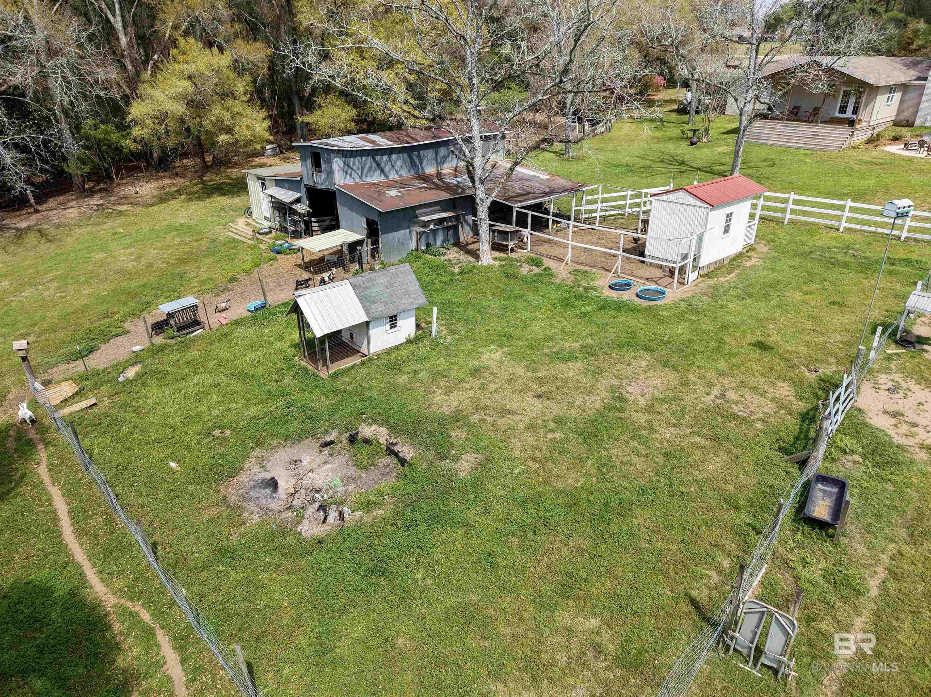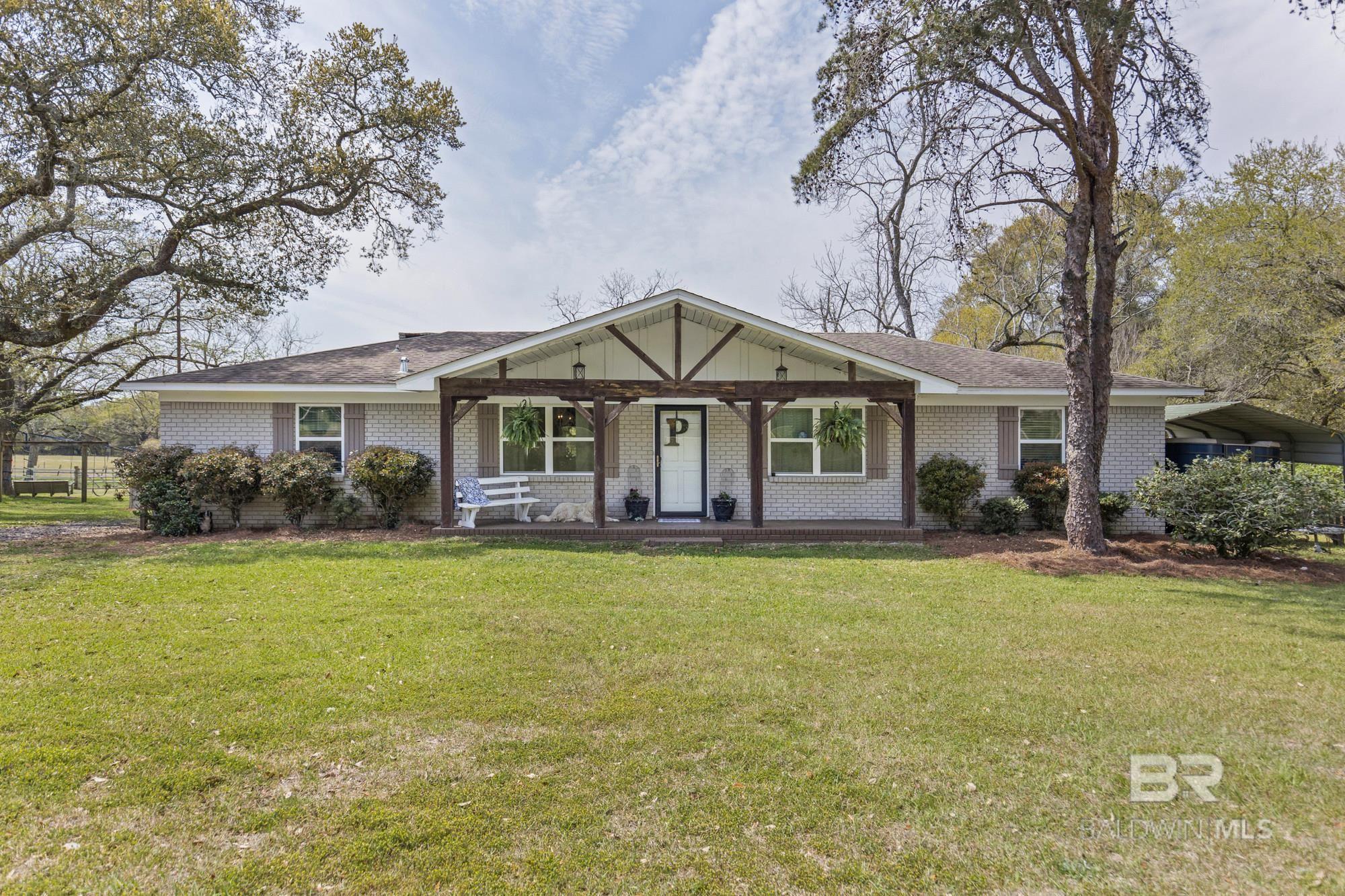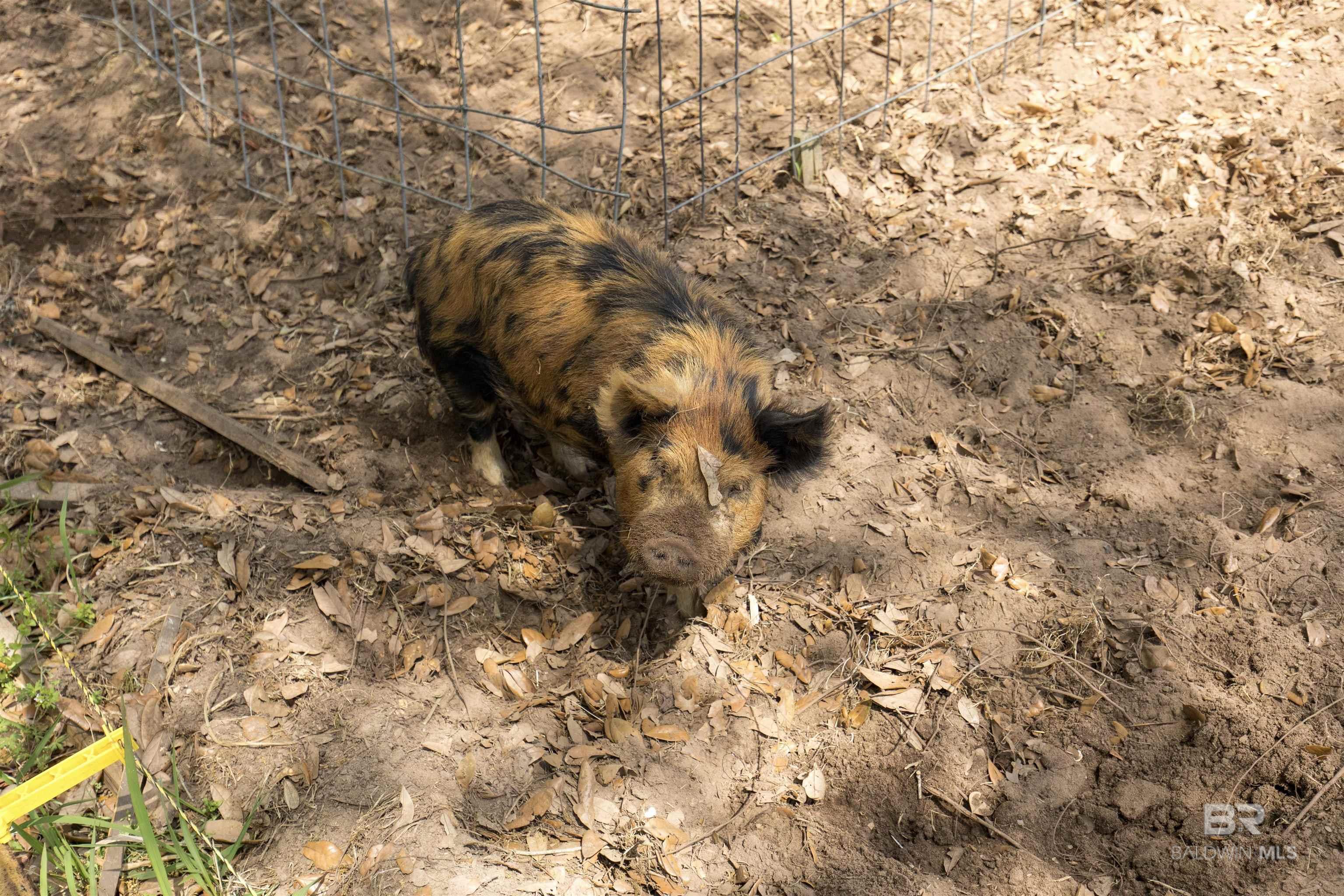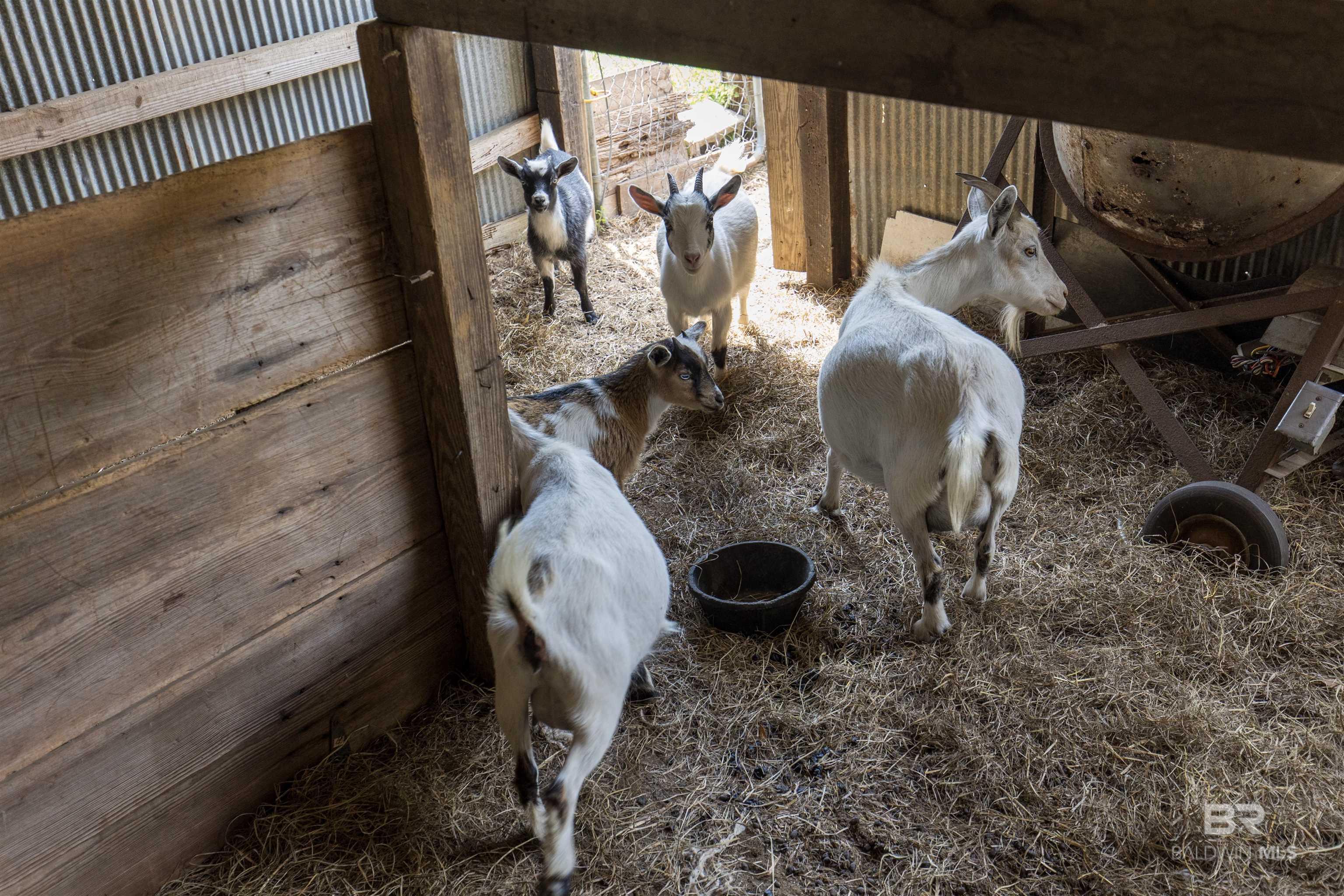 Welcome to this beautiful farmhouse-style ranch home in Theodore, AL, just minutes from I-10. This property features 6 acres of land, a huge, covered back deck, a flowing creek with some areas deep enough to swim, barn, chicken coop, storage shed, and a covered area for a boat or car. Inside, you'll find 4 bedrooms and 3 full baths, with a split bedroom layout and a sunroom off the primary suite. The open-concept living, dining, and kitchen area includes a spacious laundry room with office space off the living room, while the kitchen is equipped with an island, gas range, and pantry. Enjoy evenings on the back deck, overlooking the stunning oak trees and expansive acreage. The farm animals—pigs, goats, hens, a rooster—are optional with purchase. Per seller recent updates include: (roof 2019) windows (2023). Buyer or buyer's agent to verify all information deemed important to the buyer. Buyer to verify all information during due diligence.