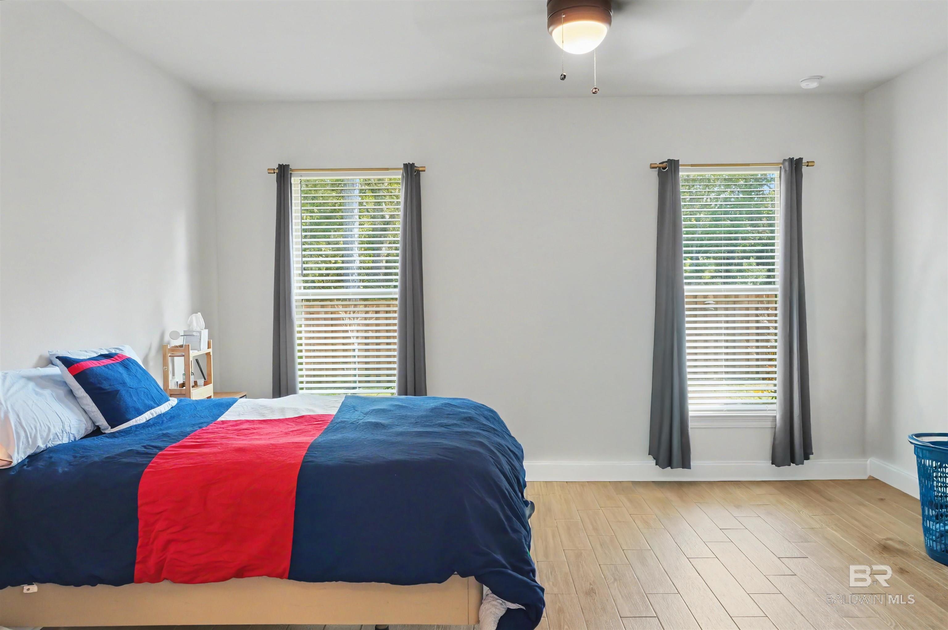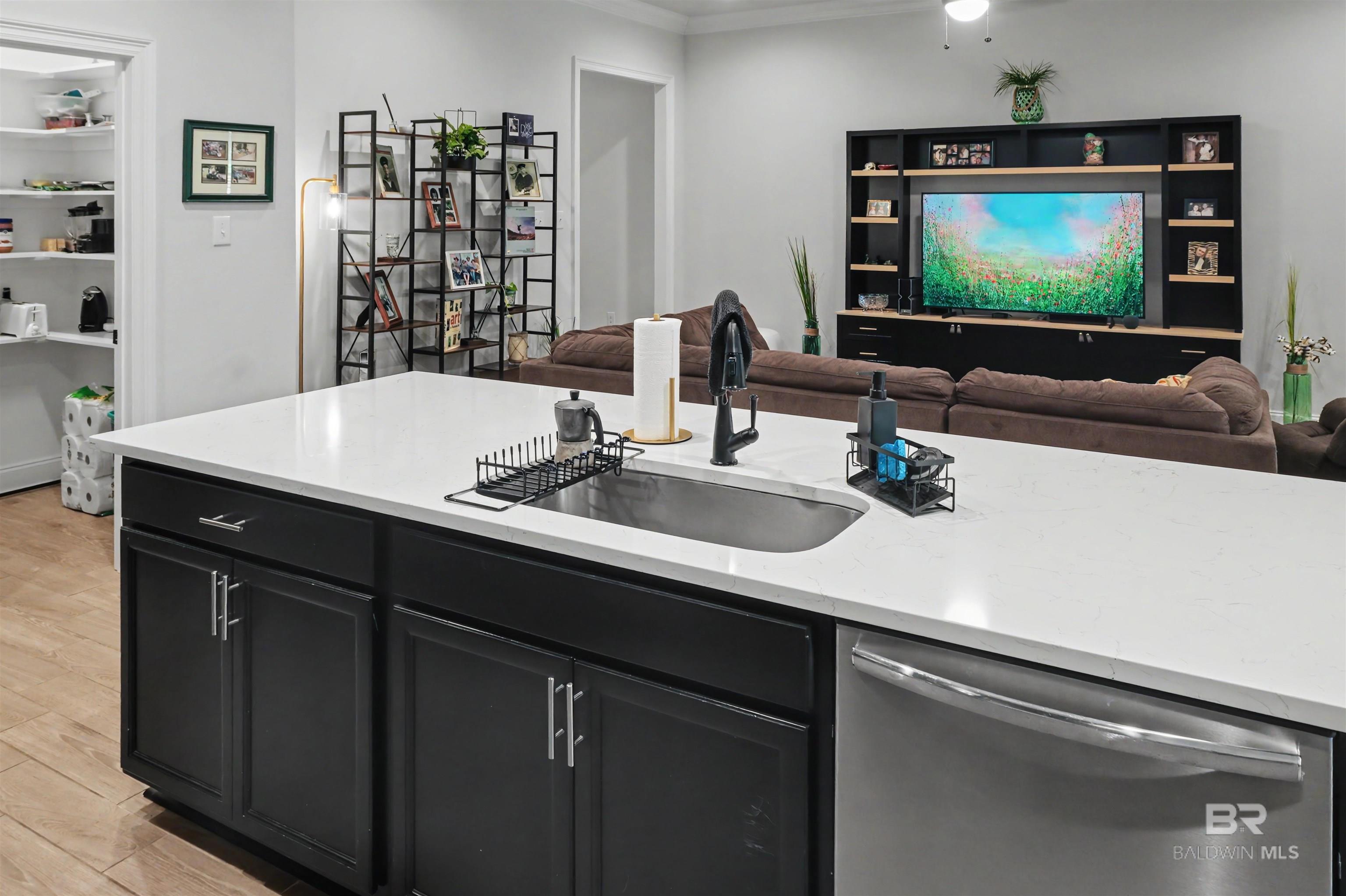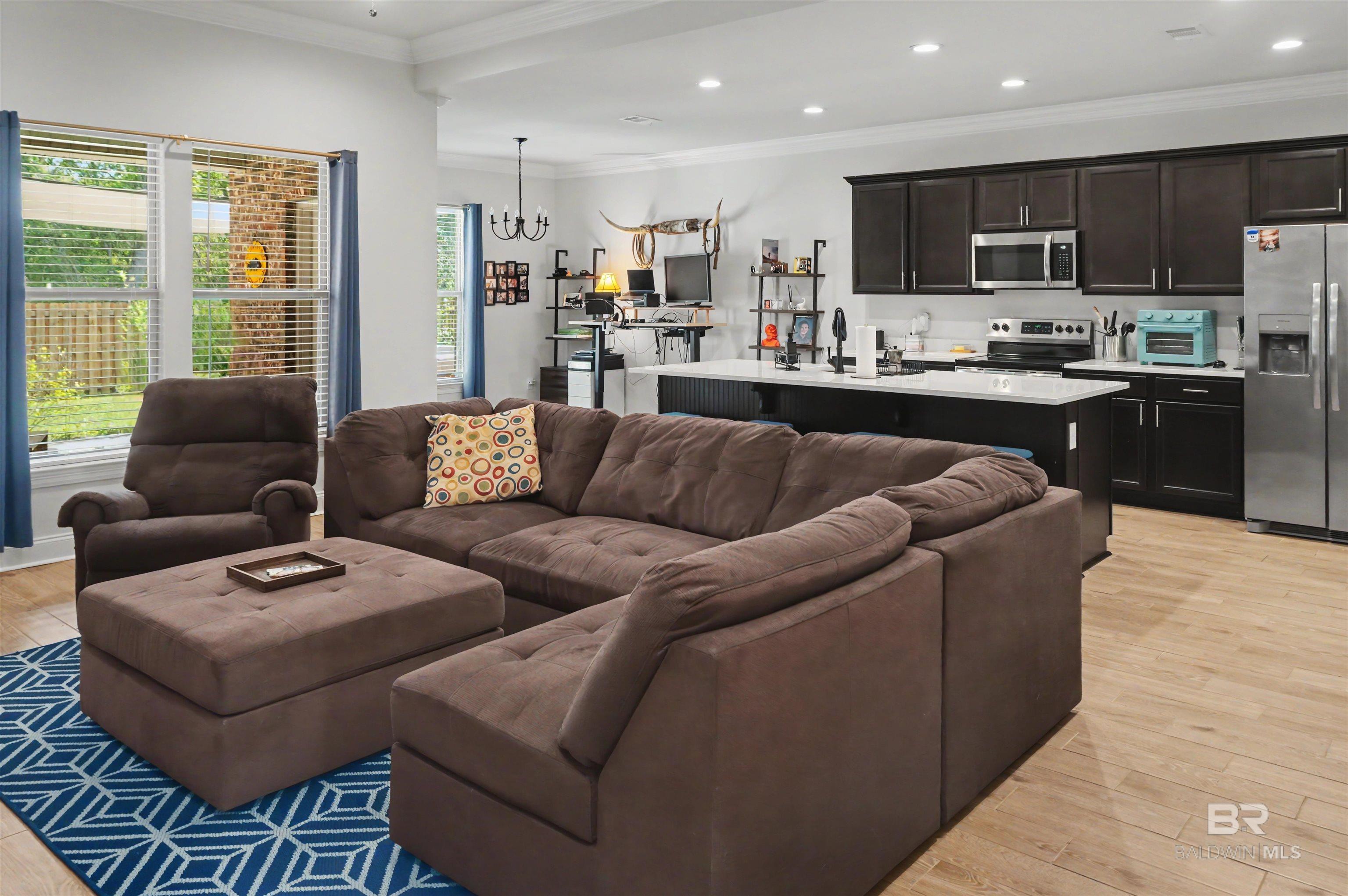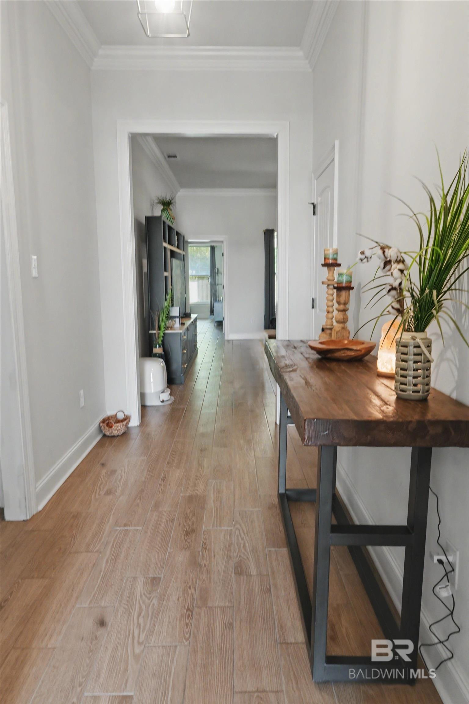 GOLD FORTIFIED 3BR/2BA home in Gulf Shores with premium upgrades throughout. Exterior features vibrant landscaping, gutters, LED coach lights, architectural 30-yr shingles, shadow-box fenced backyard, and an extended covered patio overlooking a private wood line. Inside, enjoy an open floor plan with custom ceramic tile flooring throughout, crown molding, quartz countertops, stainless steel appliances, a large kitchen island with undermount sink, and a walk-in pantry with wooden shelving. Primary suite includes a garden tub, separate walk-in shower, double vanity, and a spacious walk-in closet with wood shelving. Home also offers Low-E double-pane windows, energy-efficient appliances, and a reinforced insulated garage door. Zoned for Gulf Shores City Schools and just minutes to beaches, shopping, dining, and entertainment. Buyer to verify all information during due diligence.