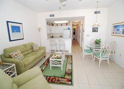 The condos are set back from the Gulf approximately three-hundred yards. This distance provides a breath-taking panoramic view of the Gulf and the island. To access our private beach, our guests just walk down a quiet sidewalk to the boardwalk! All of our units have full kitchens, washer and dryer and private balconies which overlook the Gulf of Mexico!